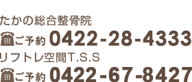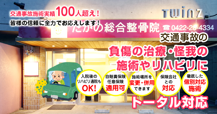 吉祥寺のたかの総合整骨院では、「交通事故での怪我の早期回復、手術後のリハビリ」も専門的に行っております。交通事故による頭部や首、肩、腕や脚の怪我など症状解消のための施術です。詳しくはお電話で問い合わせていただければと思います。