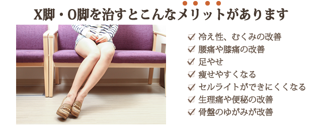 O脚のほとんどは生まれつきではありません。日常生活のちょっとした悪い習慣が、からだを歪ませてしまいます。O脚を引き起こす原因は、主に「立ち方」「歩き方」「座り方」といったもの。こういった原因を一つ一つ取り除いていくことも大切です。当院では、手技治療やトレーニング、日常生活での姿勢の指導などで、治療後もいつまでも美しい脚のラインを維持できるようサポートします。